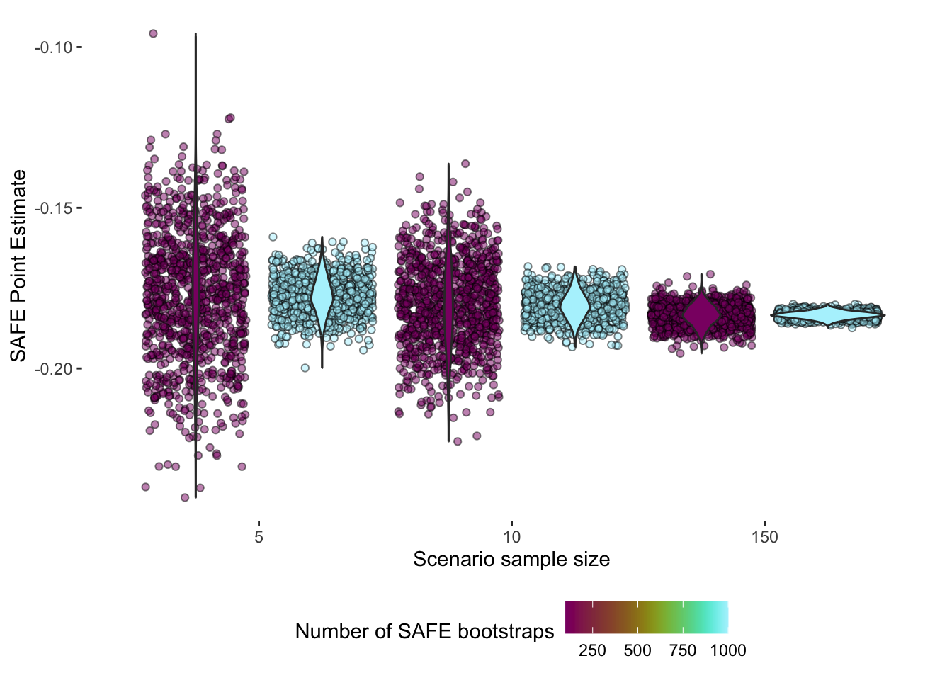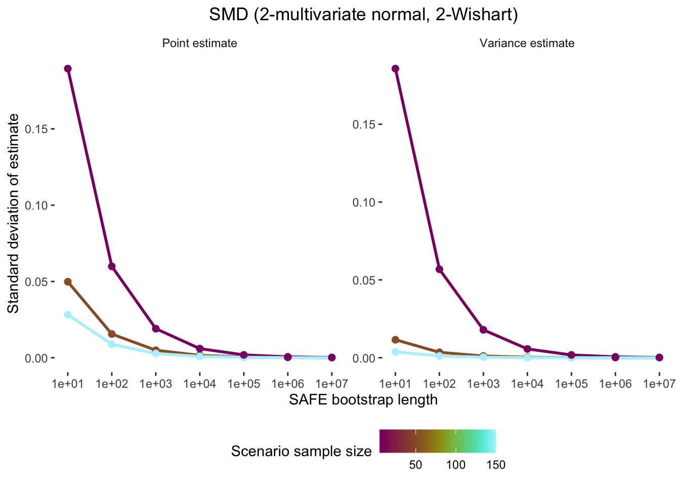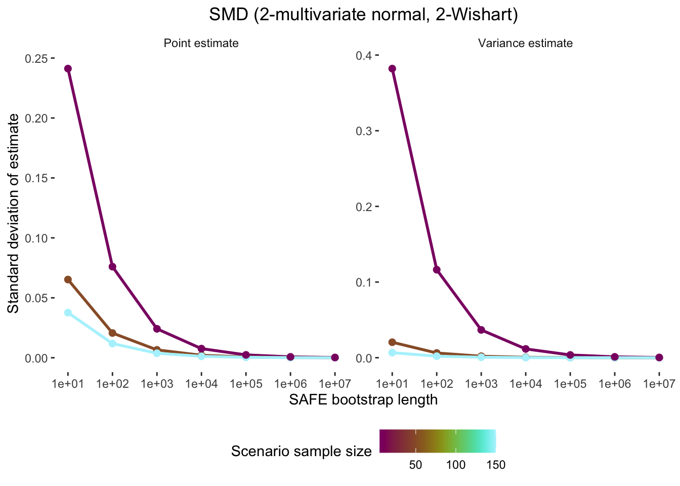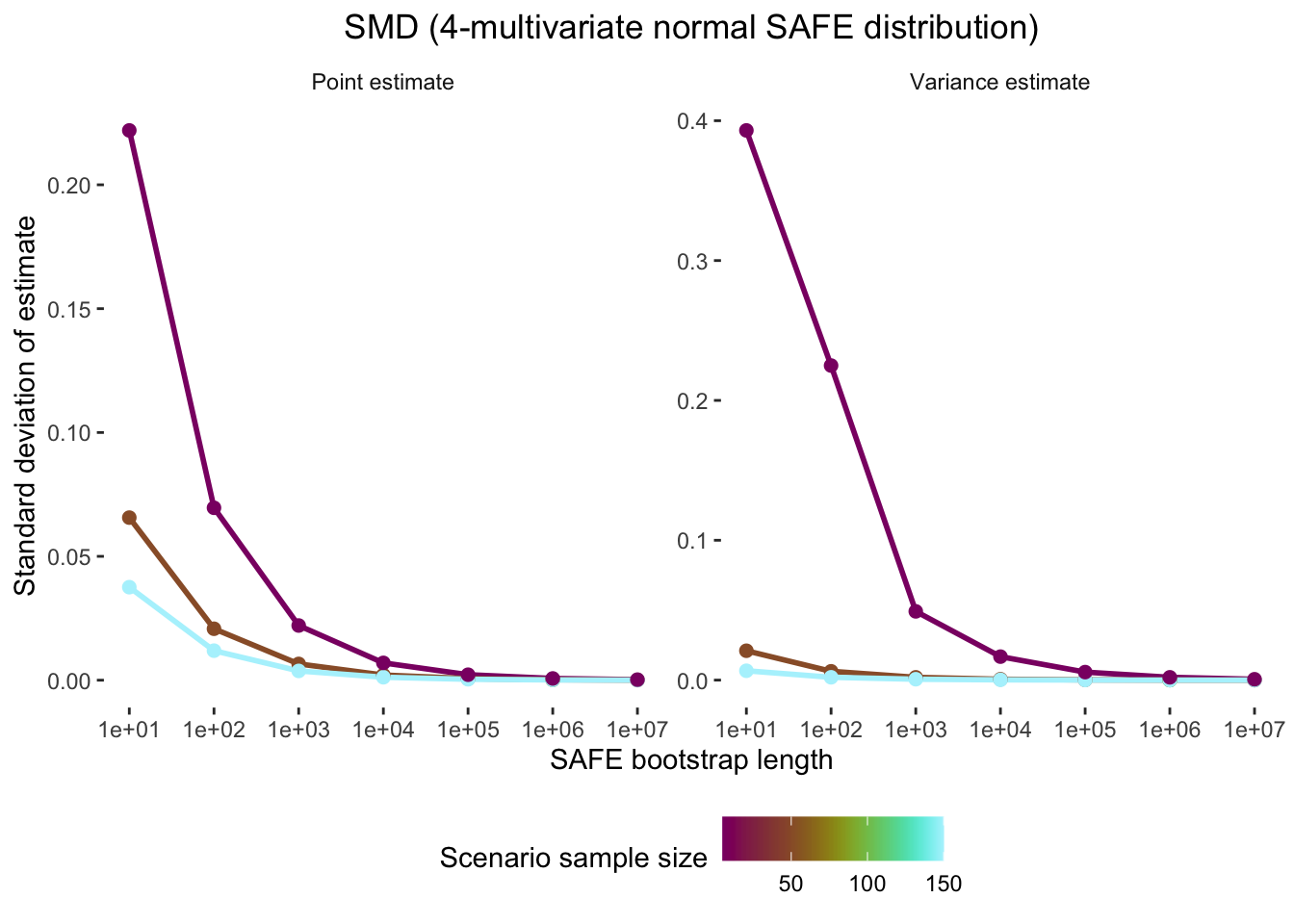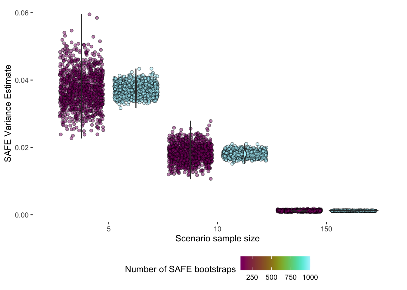 It looks like the dispersion in estimates is shaped by number of SAFE bootstraps and improves considerably with 1,000 bootstraps, especially at low sample sizes. Another way to visualize this (which we’ll use below in the proper 1e5 simulations) is to plot the standard deviation.