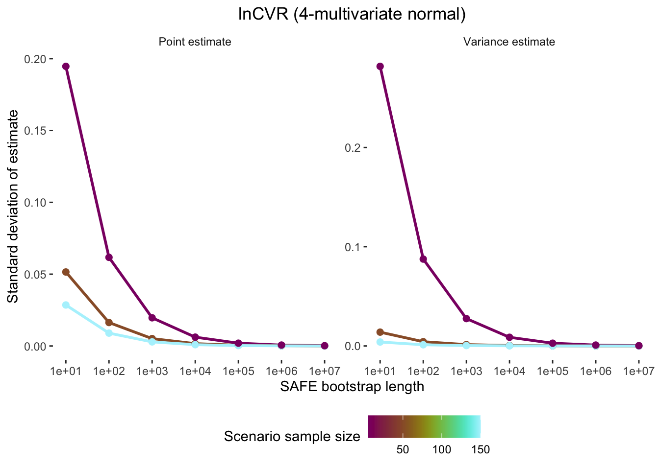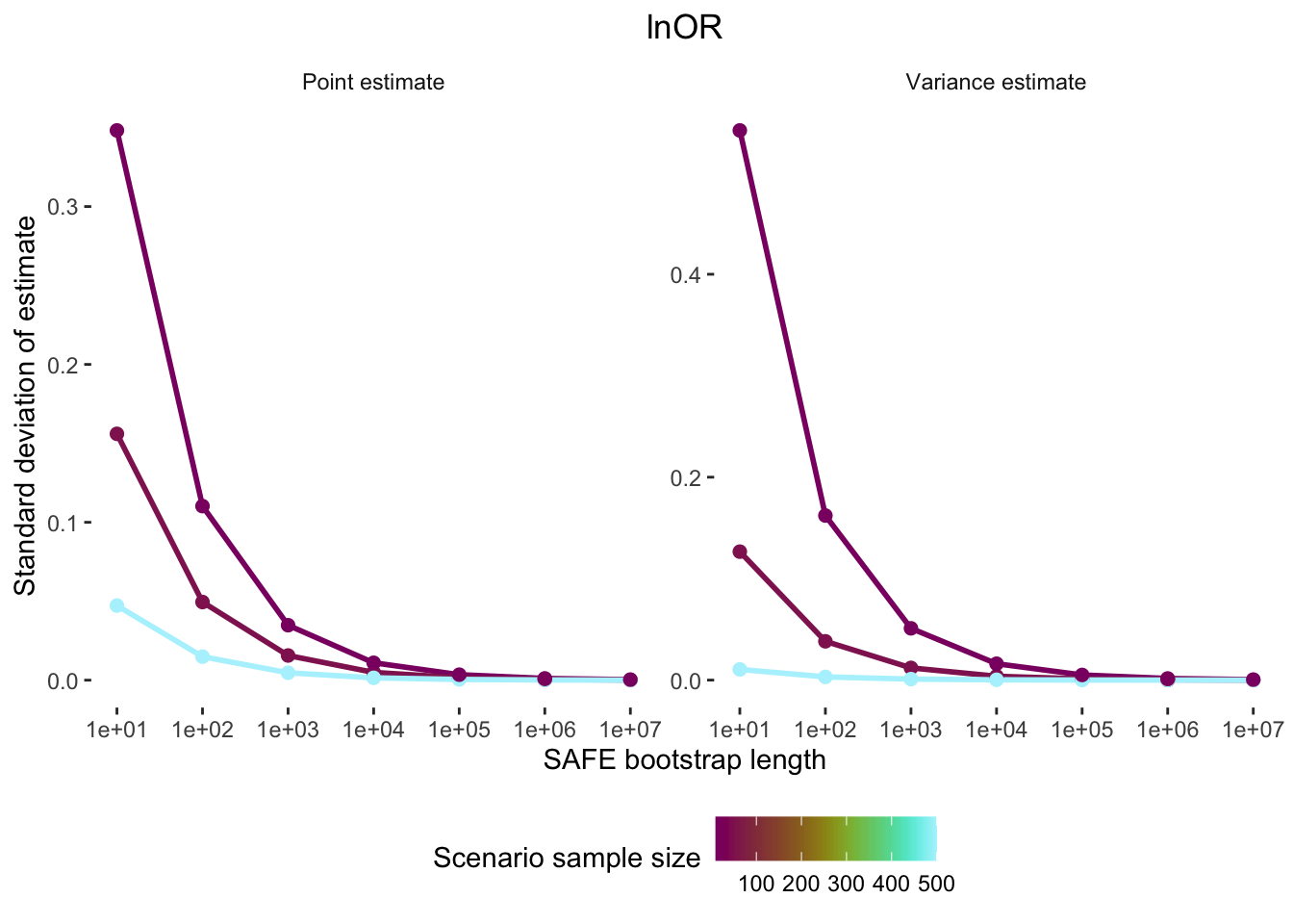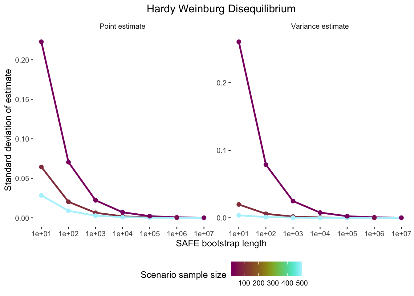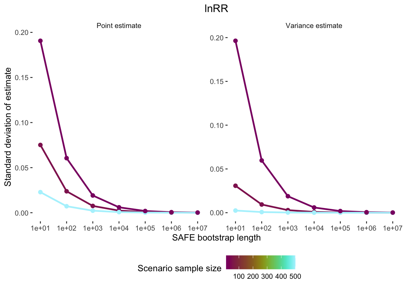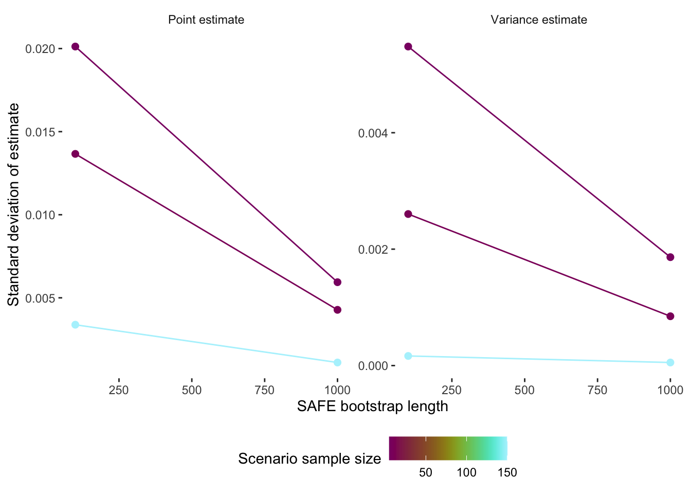 Let’s look at the dispersion of the SAFE estimates as a function of sample size and bootstrap length.