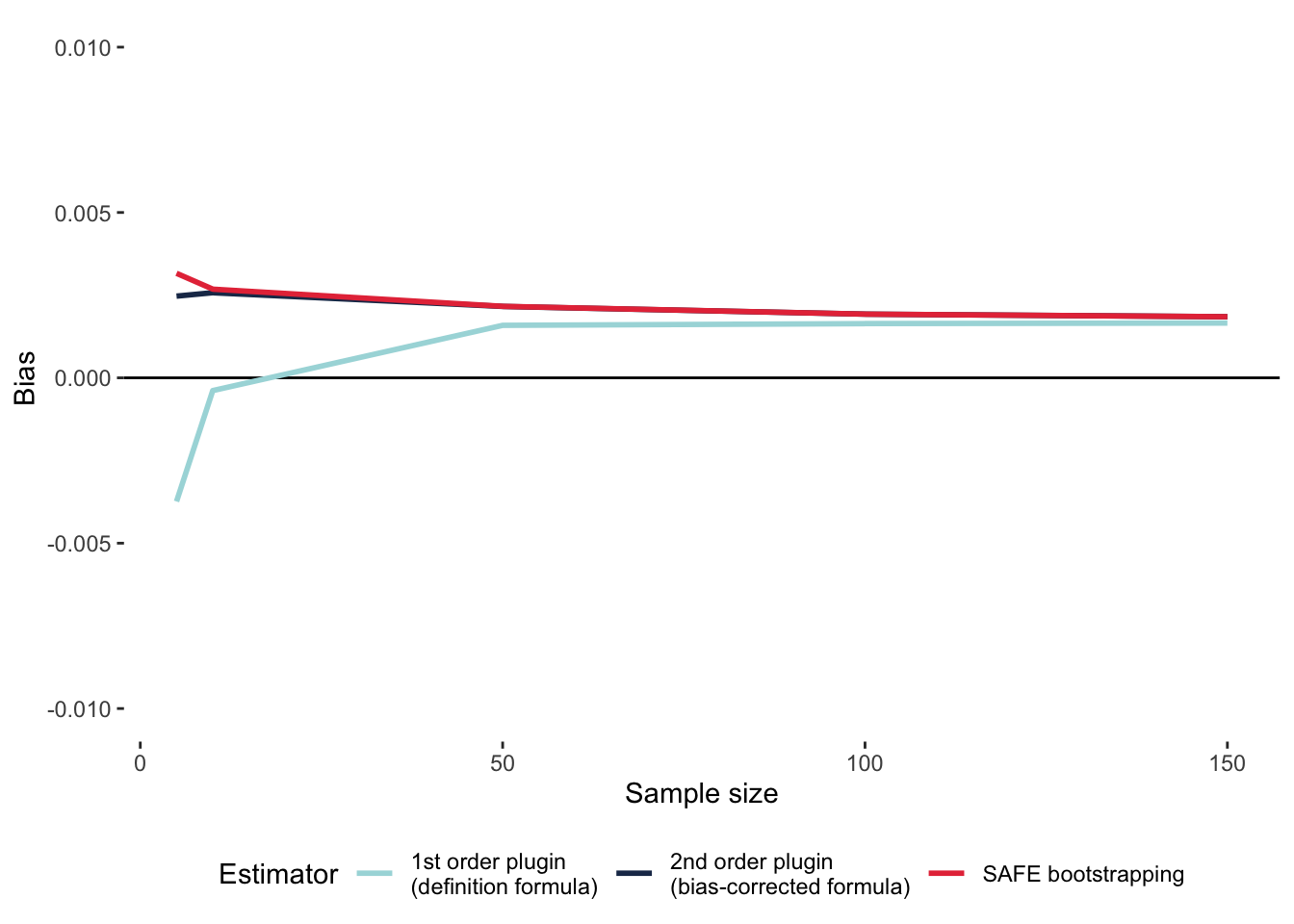 Recall that bias is measuring how different the bootstrapped estimate is from the plugin estimate. Essentially, we know the bootstrap sample is biased with small sample sizes, so what we want to do is measure how different the plugin effect size is from the bootstrap sample mean (@eqn-bias):