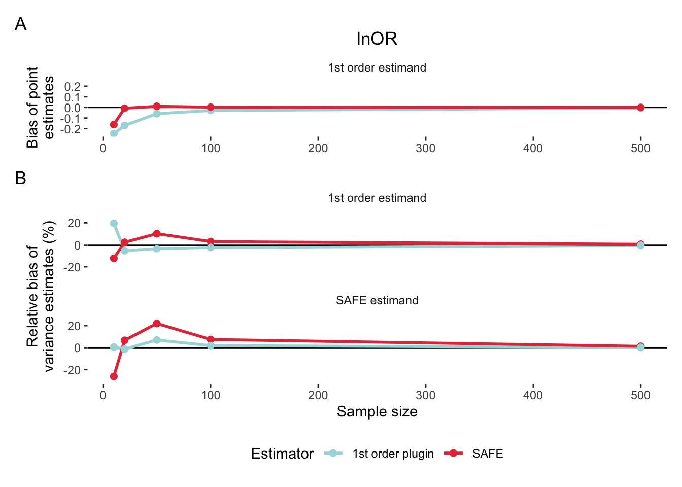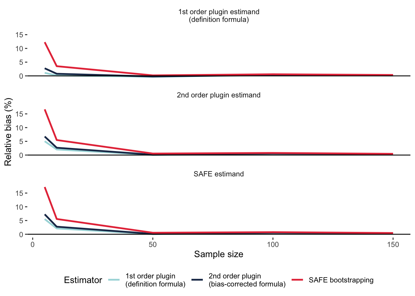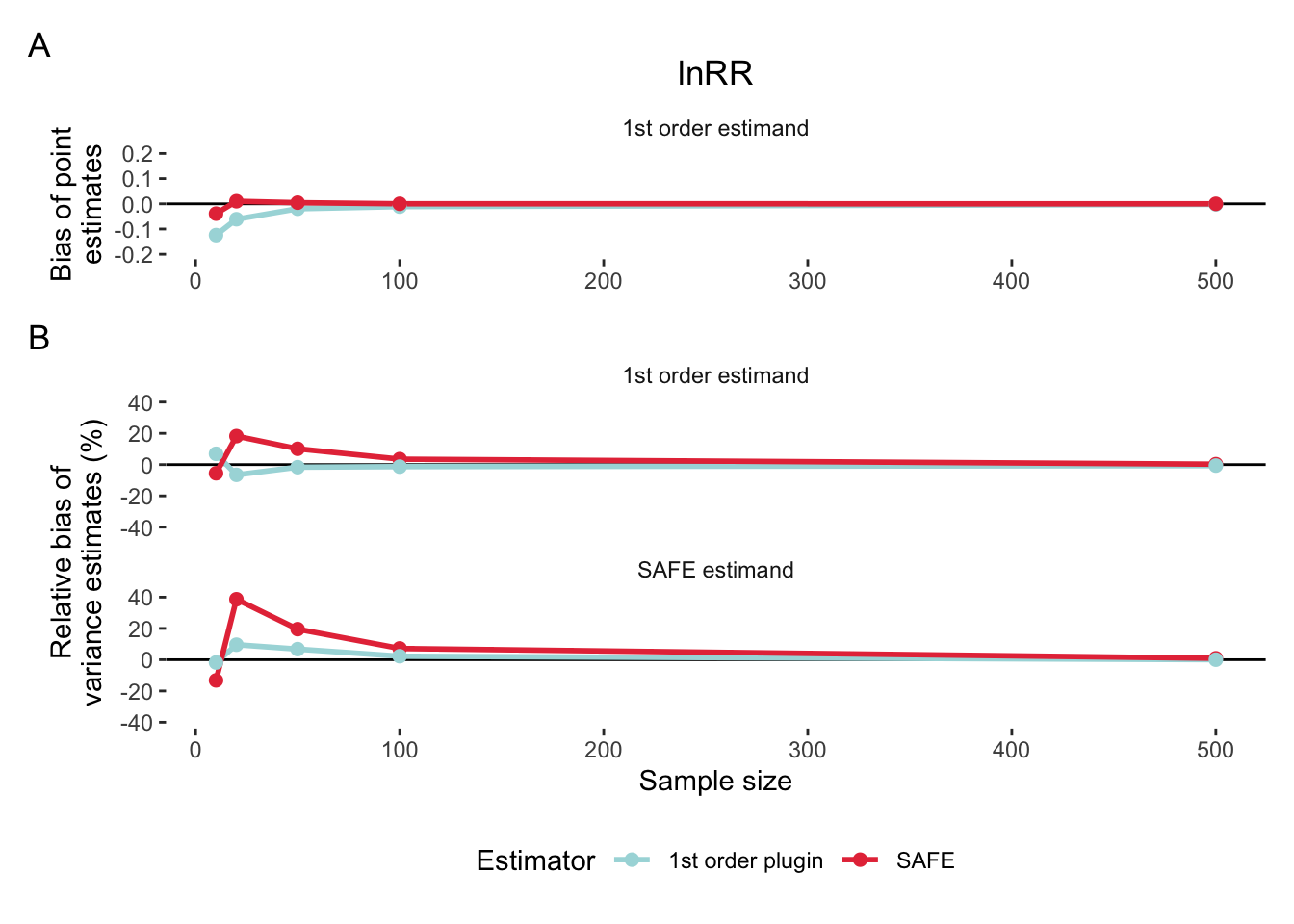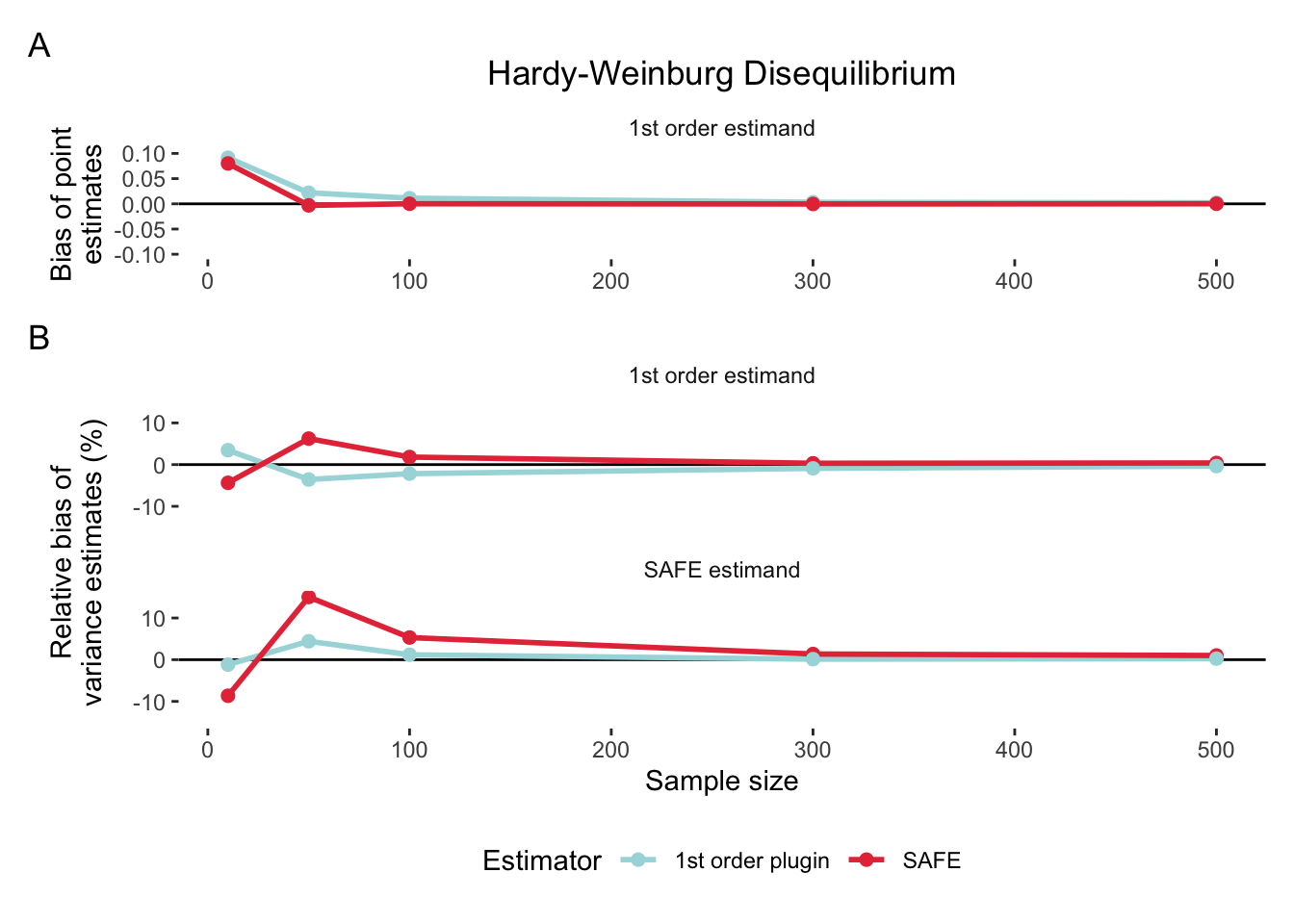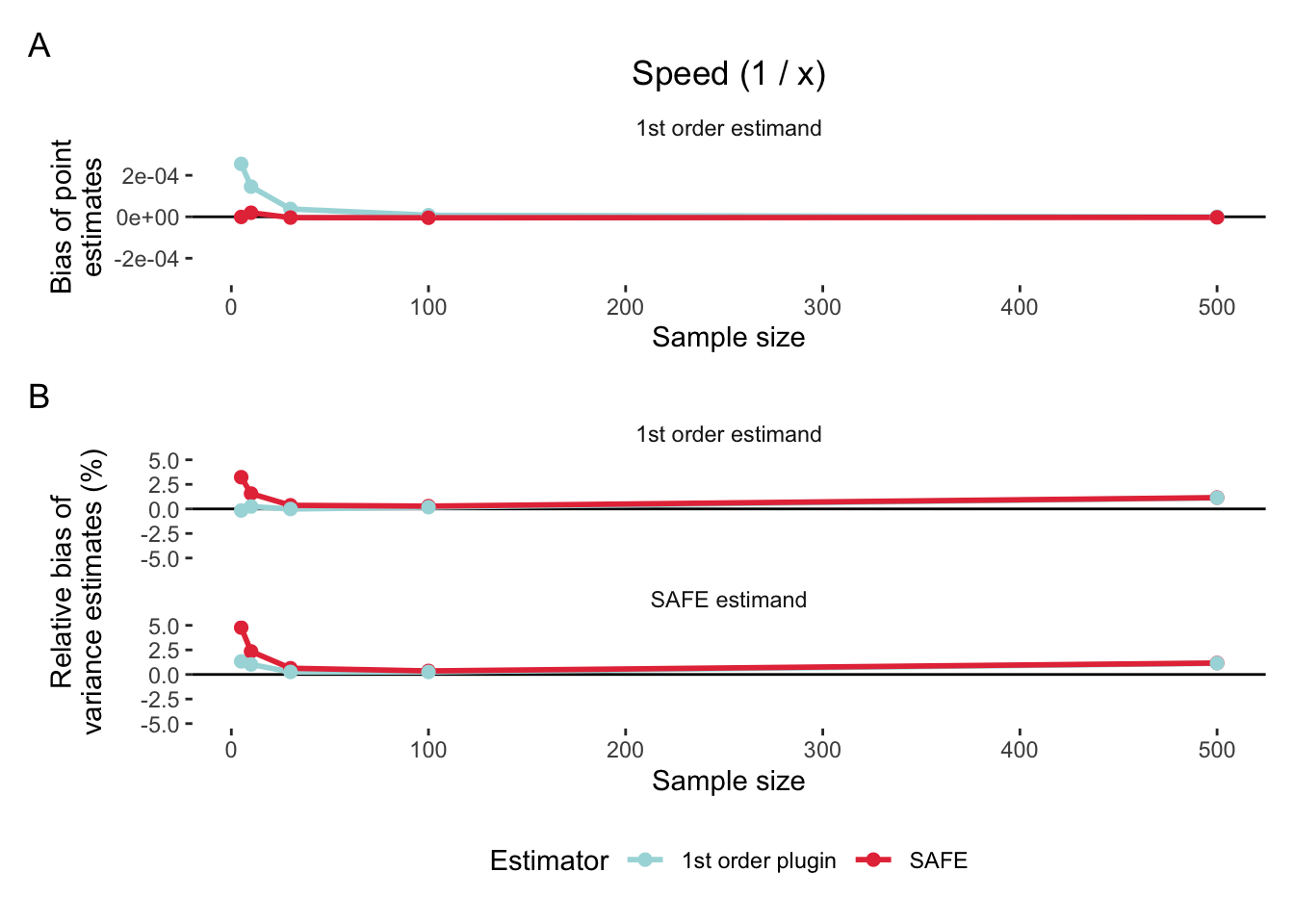 So similar! And potentially less biased. Let’s find out. Below, we’ll use Monte Carlo simulations to compare the bias of estimates from SAFE to estimates from just plugging into a formula. But first, let’s introduce a helpful function for calculating SAFE for a variety of effect sizes.