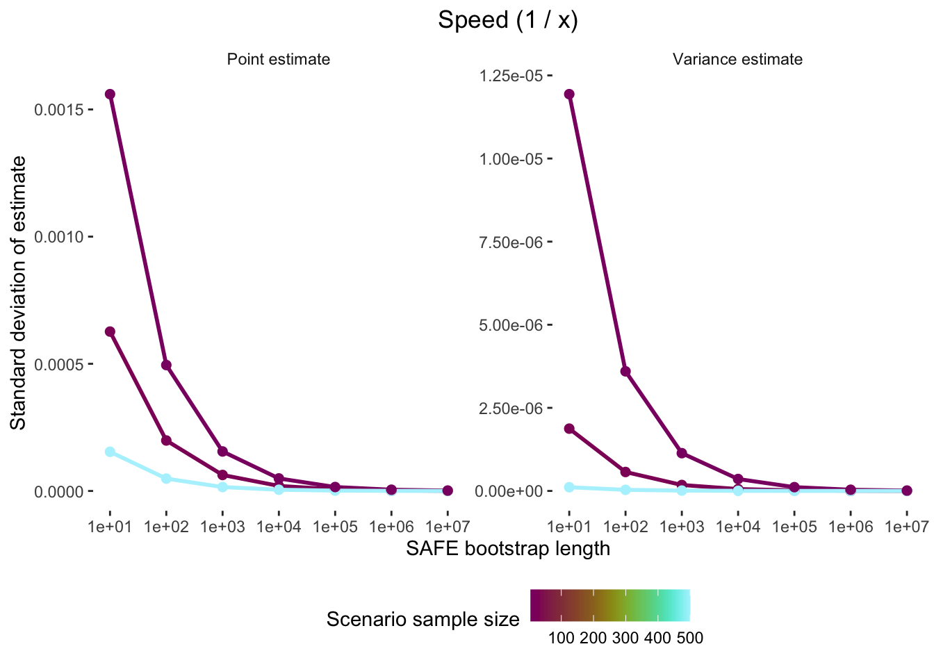 Once again, here’s our novel effect size ‘speed’, 1 / x. How do our SAFE estimates of speed and its sampling variance change as we changed the number of bootstraps?