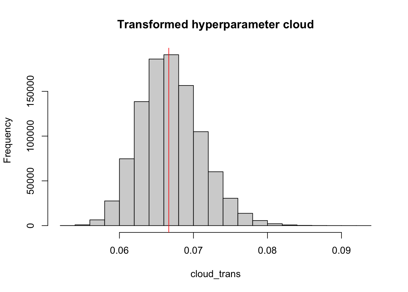 hist(cloud_trans, main = "Transformed hyperparameter cloud")